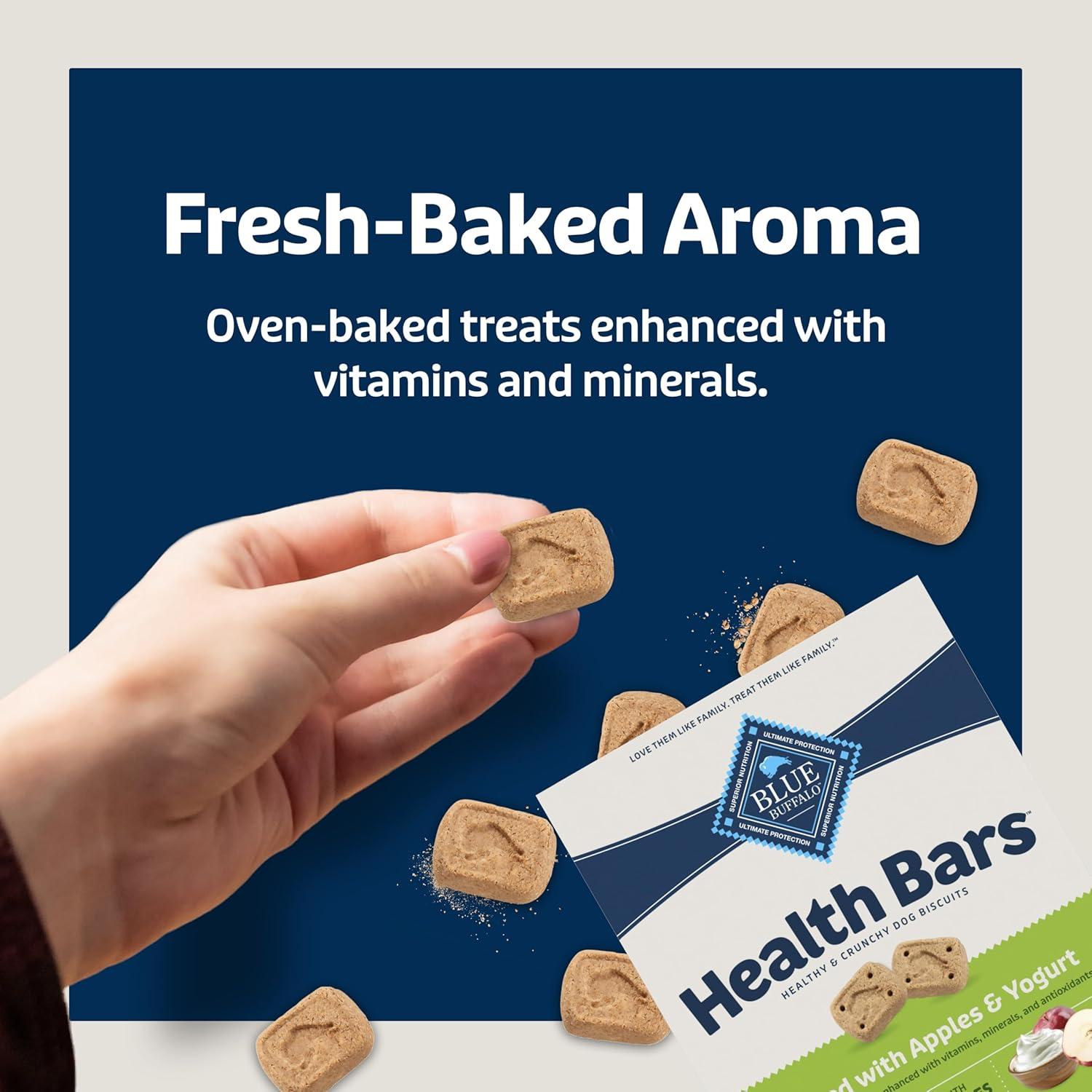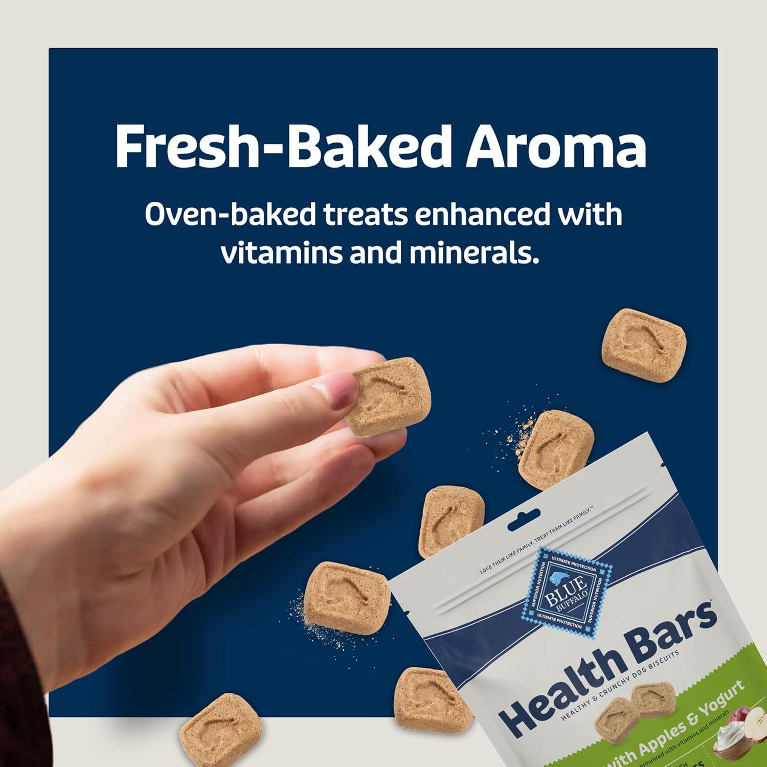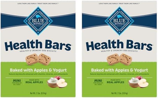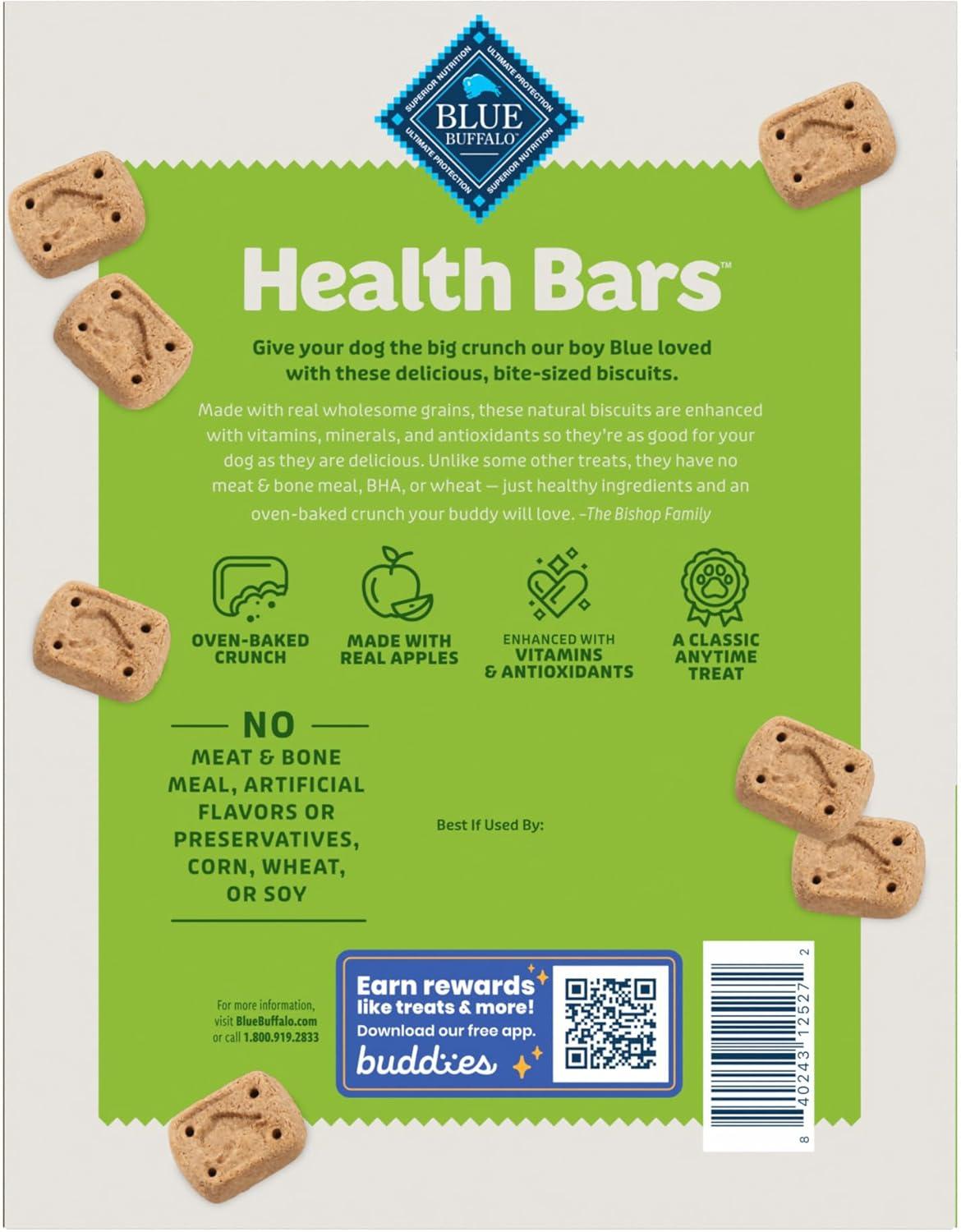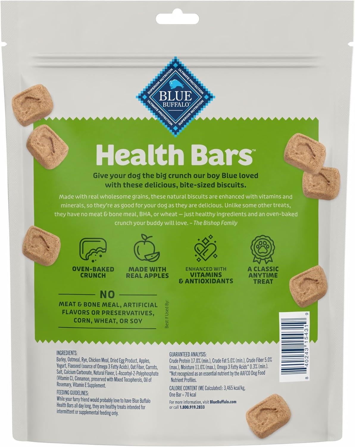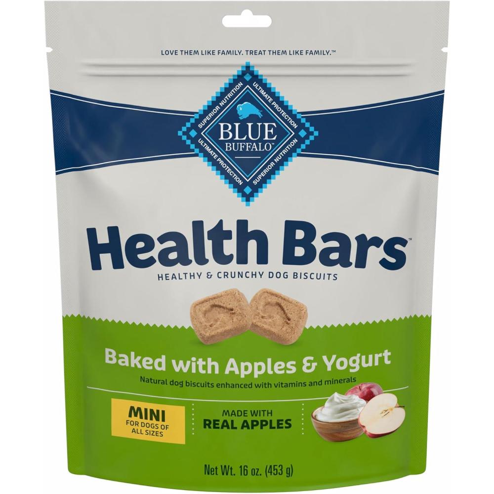 INCLUDED IN PACKAGE: Contains One (1) 16-oz bag of BLUE Health Bars Mini Crunchy Dog Biscuits, Oven-Baked with Natural Ingredients, Apples & Yogurt