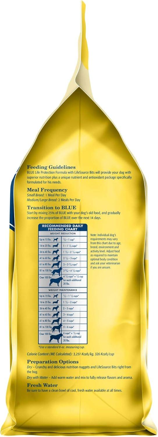 Formulated for the health and well-being of adult dogs, BLUE Life Protection Formula Salmon and Brown Rice dry dog food is made with the finest natural ingredients enhanced with vitamins, minerals, and other nutrients. It’s a high-quality, balanced recipe you can both feel great about. Designed to help your dog thrive, this formula starts with real salmon, is chicken-free, and contains no chicken (or poultry) by-product meals, no corn, wheat, or soy, and no artificial flavors or preservatives. Like all BLUE dry foods, BLUE Life Protection Formula includes exclusive, antioxidant-rich LifeSource Bits to support a healthy immune system in your adult dog.  Give your dog the balanced nutrition of BLUE Life Protection Formula today. BLUE Life Protection Formula is brought to you by Blue Buffalo, the leader in natural pet food. Blue Buffalo makes premium-quality pet foods featuring real meat, fruit, and vegetables. Love them like family. Feed them like family.